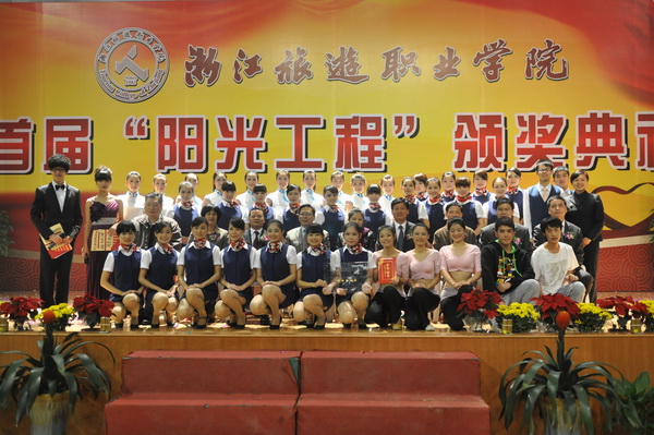 “坐标、明德、起航,人人争做优秀旅游人;阳光、自信、健康,旅院伴你一路共成长。”11月9日晚,浙江旅游职业学院首届阳光工程颁奖典礼在精致馆盛大举行。全国人大代表、全国五一劳动奖章获得者、全国模范导游员、全国十大杰出青年、100位新中国成立以来感动中国人物文花枝女士受邀亲临现场,滨江高教园区管委会主任朱鸿飞,浙江省教育发展中心主任林成格,杭州市公安局经文保支队副大队长冯澜,以及学院领导金炳雄、董捷、陈宝珠、徐云松、王忠林出席典礼。教务处、学生处、后勤服务公司主要负责人以及各系党总支书记、班主任和学生代表参加典礼。