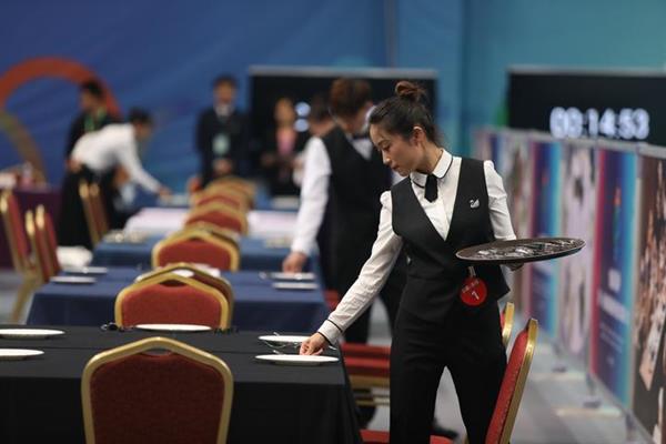 在中餐和西餐宴会摆台比赛现场,选手们则显得更加忙碌。台布、装饰布、餐巾、花瓶、餐碟、味碟、汤勺、汤碗、牙签、长柄勺、水杯、菜单等东西,都要一件件摆放到位。比赛还有更细致的要求,比如要求选手头发干净、发型、服装、鞋子、袜子符合岗位要求,指甲修剪整齐、不能涂有色指甲油。