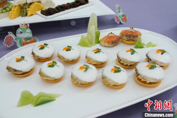 12月27日,浙江杭州,由橙粒、大闸蟹等制成的菜肴“太白金星来惩凶”。中新社记者 曹丹 摄