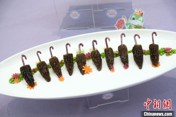 12月27日,浙江杭州,由虾茸、羊肚菌等制成的菜肴“借伞定情同舟归”。中新社记者 曹丹 摄