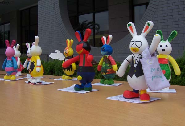 5月19日中午,“布”期“偶”遇系列活动之三——布偶现场PK赛以及Baby兔手工绘画的评比活动在一号教学楼和2号教学楼间同时举办。一些喜爱手工制作的同学也趁此机会,一展身手。有制作小熊的,兔子的,小花的,胡萝卜的……有个人制作的,也有团队合作的,现场一直充满着同学们的欢声笑语。而Baby兔DIY的同学们积极也充分发挥了自己的想象力和创作力,为一只只裸兔穿上了五彩缤纷的外衣,给在现场观摩的老师以及同学们带来了重重惊喜。