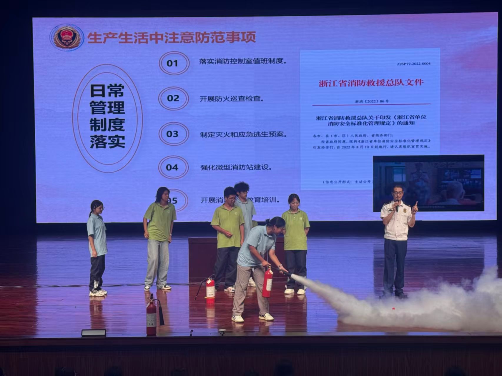 9月24日晚上,浙江省消防救援总队训练与战勤保障支队一级督导员俞颖飞,以“关注消防安全、牢记生命至上”为主题,为全体新生讲授消防安全知识。俞督导结合近年来发生的典型火灾案例,通过图文并茂的形式,深入剖析了学校消防安全存在的突出风险点,系统讲解了火灾预防、隐患排查、逃生自救等方面的专业知识。俞督导还现场与学生互动演示了消防器材的正确使用方法,介绍了紧急情况下的逃生技巧和注意事项。同时,他要求同学们学会并掌握基本的消防技能,时刻树立消防安全意识,做到防患于未然。