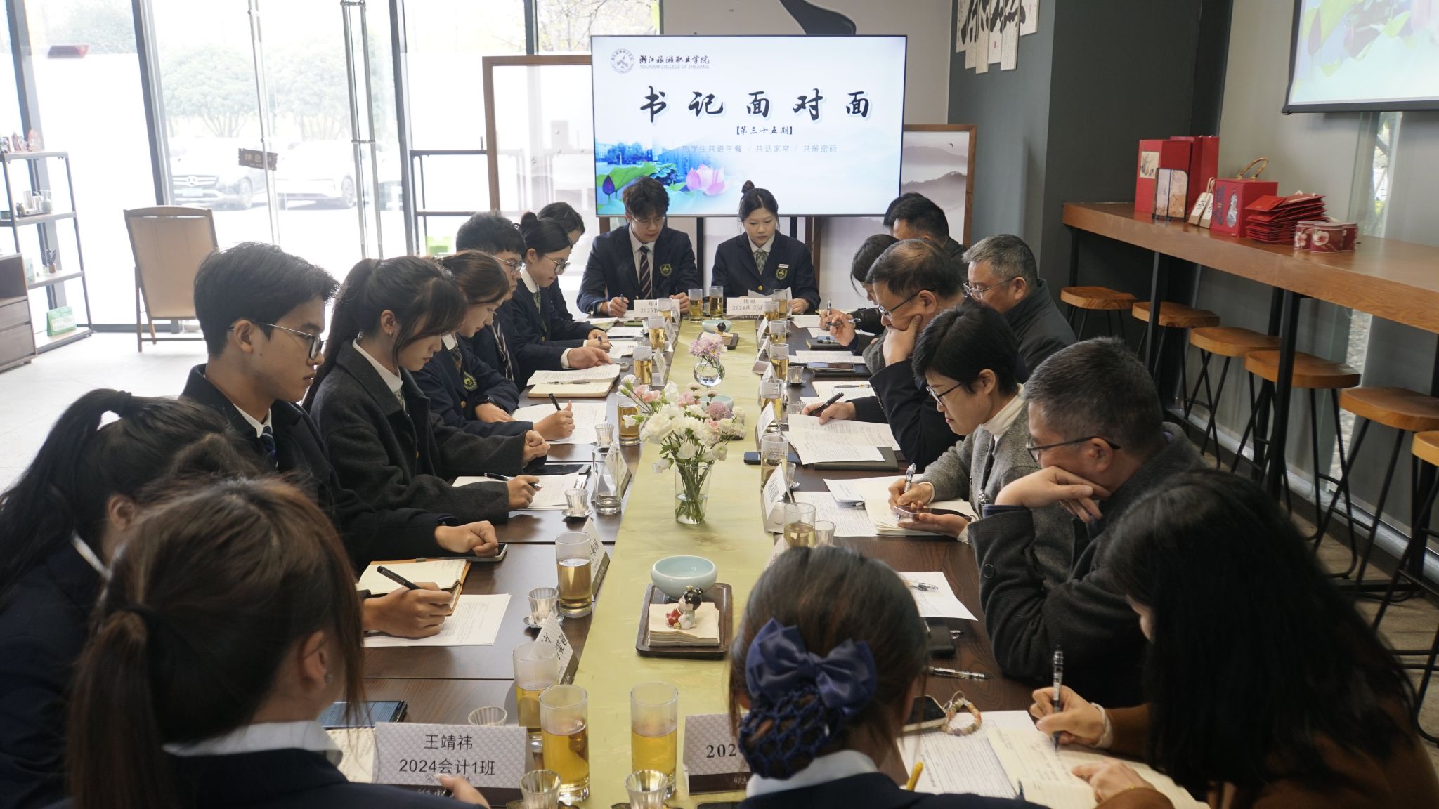 12月8日,第三十五期“书记面对面”暨学校十五五规划发展学生座谈会在茶庑召开。学校党委书记毛东辉,党委副书记李向晟,党委委员、宣传统战部部长马盈出席会议,相关职能部门负责人及来自各二级学院11位学生干部代表参加座谈。会议由学生工作部部长徐初娜主持。