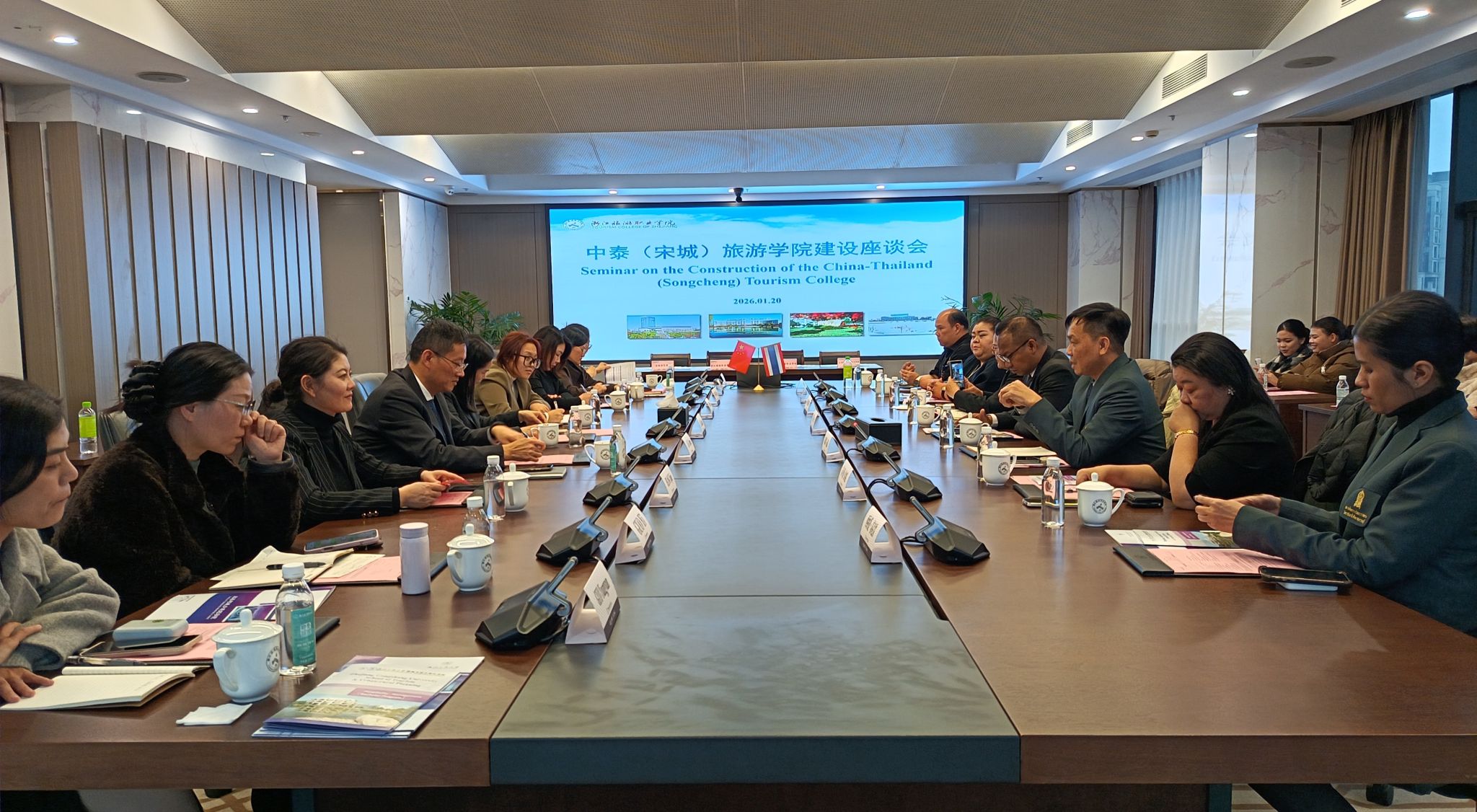1月20日,中泰(宋城)旅游学院建设座谈会在学校召开。泰国普吉职业学院校长维塔亚·初给,素攀武里职业学院校长宋武特·阮泰,学校校长杜兰晓,党委委员、副校长郎富平出席会议,宋城演艺集团、浙江工商大学等合作单位代表、学校相关部门负责人参加会议。