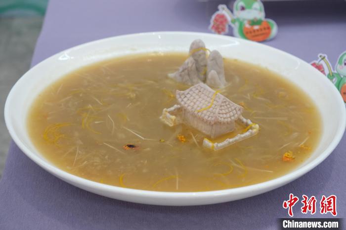 12月27日,浙江杭州,由猪肉、白鳗等制成的菜肴“雷峰塔下镇白蛇”。中新社记者 曹丹 摄