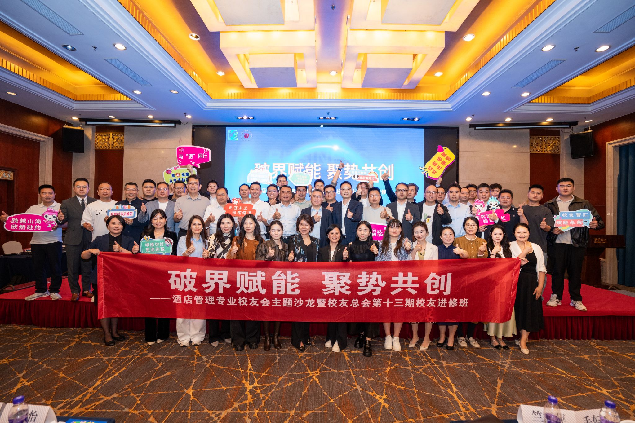 5月9日,酒店管理专业校友会联合校友总会共同举办的“破界赋能 聚势共创”校友会主题沙龙暨校友总会第13期校友进修班在杭州新侨饭店举行。学校党委书记毛东辉,党委委员、副校长章笕,总督学、学术委员会主任、校友总会名誉副会长周国忠等领导出席,相关部门负责人及70余名校友参加。会上,周国忠及酒店管理专业校友会会长、杭州新侨饭店总经理竺丽萍分别致辞。