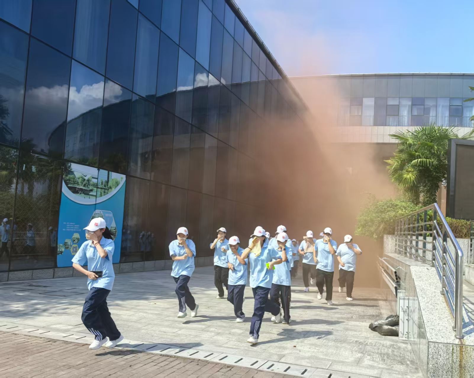 9月26日13点30分,随着安保部工作人员点燃烟雾弹,消防疏散逃生演练正式开始,在防空警报声被拉响后,宿管员迅速打开所有消防逃生通道,楼内学生迅速反应,在宿管员的引导下有序下楼,快速撤离到室外的空旷地带。随后,在军训教官的带领下,同学们用湿毛巾捂住口鼻,保持弯腰低姿,快速穿越浓烟滚滚的“火灾现场”, 安全撤离地抵达集合地点并清点人数,整个演练过程组织严密,参与人员反应迅速,应对得当,演练圆满完成。