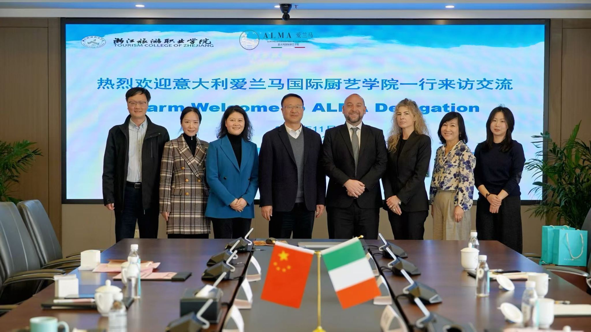 李向晟向加布里埃莱·拜斯特罗基一行介绍了我校办学特色、专业设置及国际化建设成效,回顾了中意厨艺学院的建设成果,期待两校在课程体系共建、师资互访机制、学生海外研修等方面取得新突破。同时希望浙旅院本土化实践优势与爱兰马国际化教学资源形成互补,为中西餐饮文化互学互鉴、融合创新开辟新路径,为全球餐饮行业培育兼具传统技艺与创新视野的专业人才。